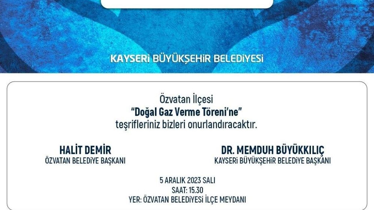 Büyükşehir Belediye Başkanı Dr. Memduh Büyükkılıç ve protokolün katılımlarıyla Salı günü saat 14.30’da Felahiye Belediyesi ilçe meydanında, saat 15.30’da ise Özvatan Belediyesi ilçe meydanında iki ilçeye doğal gaz verme töreni düzenlenecek.
