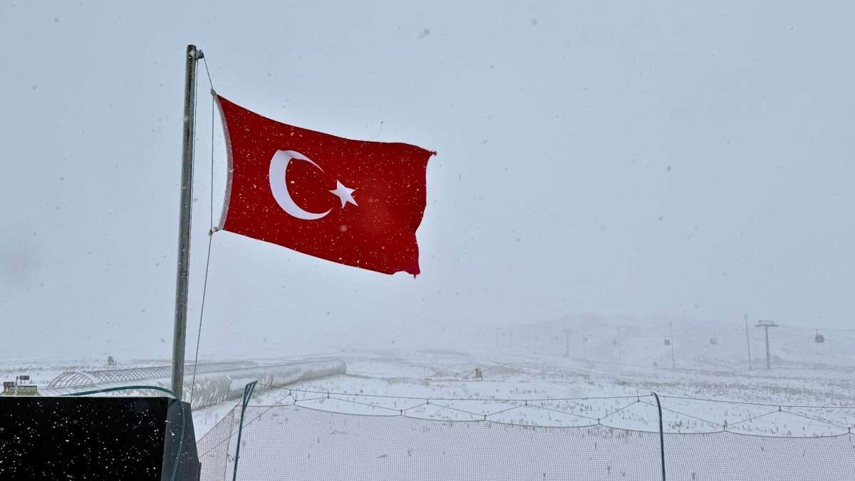 Kayseri Erciyes'te Türk bayrağı kar yağışı altında dalgalanırken arka plandaki pistler hafif bir beyaz örtüyle kaplanmış. Erciyes'te sezon açılışı çok yakın...